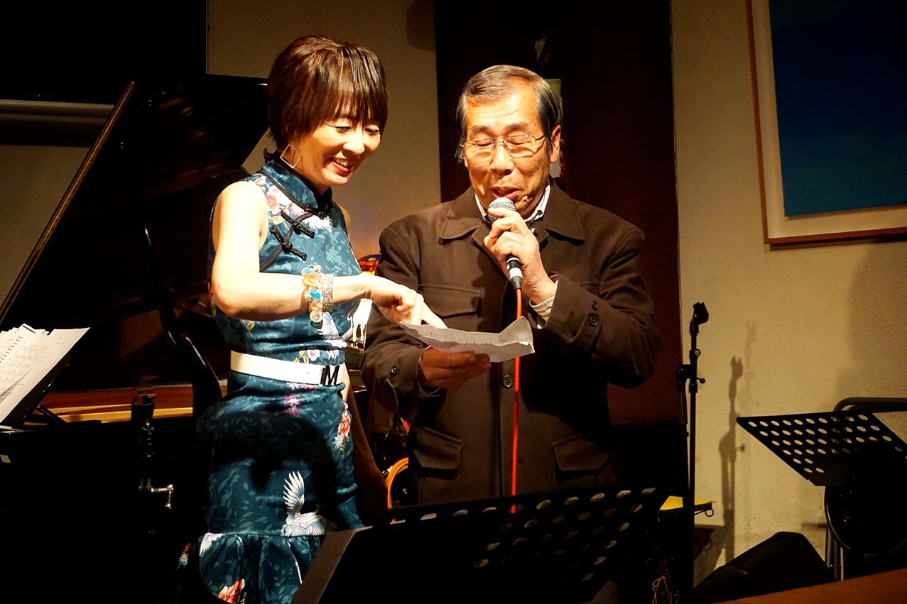 福田 重男(p)さんのピアノ伴奏で、深みのある、しっとりとした声質でジャズスタンダードソングを聴かせてくれました。(写真はマミコ バード(p)さんのマネージャーさんが撮影)